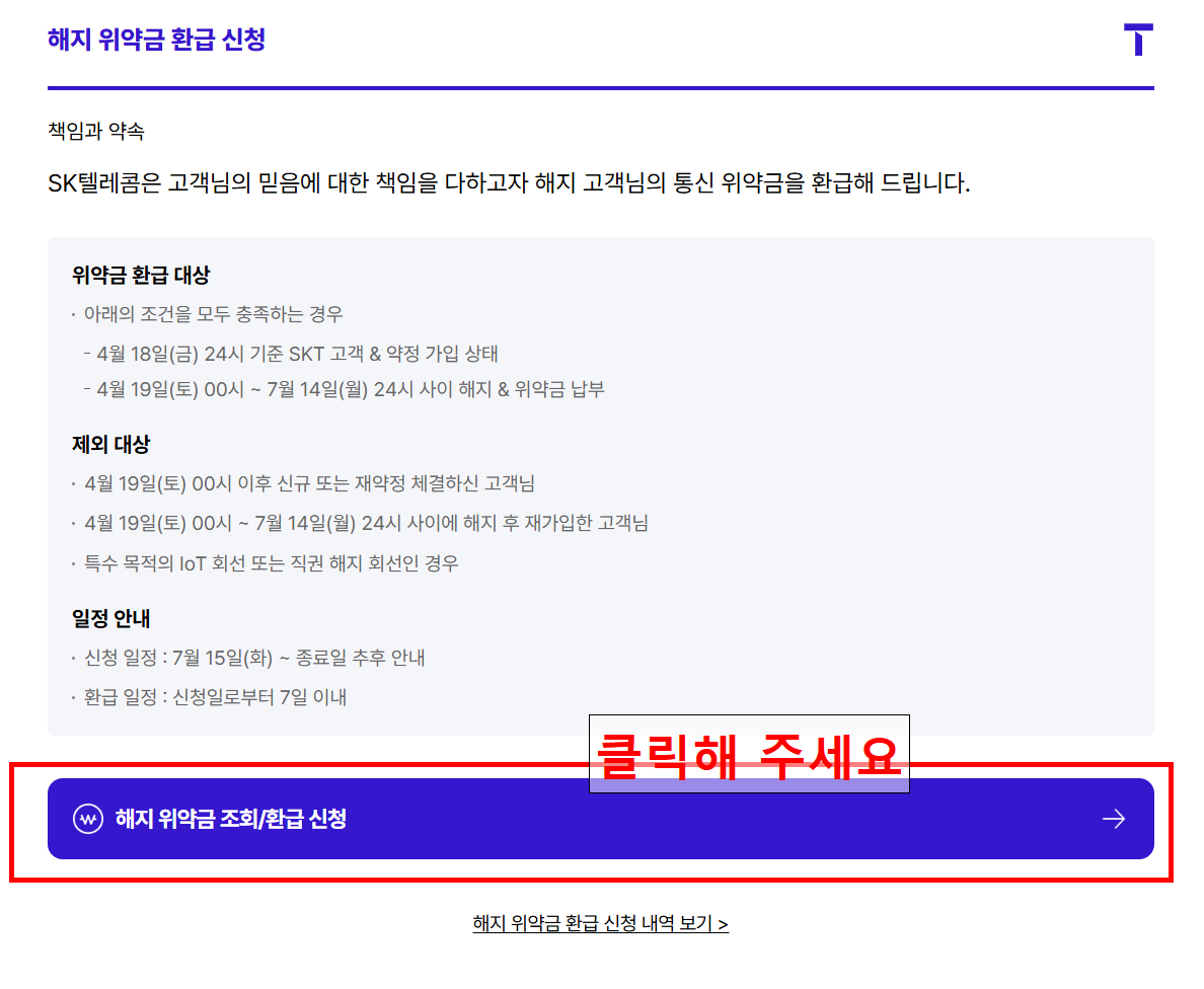 - 보이스피싱 주의: SKT는 환급을 명목으로 절대 현금카드나 비밀번호 등 민감한 금융 정보를 요구하지 않습니다. 공식 채널(T월드, 공식 대리점, 고객센터)을 통해서만 신청하시기 바랍니다.